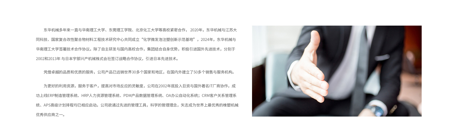 東華機械有限公司是大同機械有限公司(港股上市企業)旗下核心子公司,1986年成立,主營全自動注塑機及其附屬設備的生產,公司占地面積約20萬平方米,員工近1000人。公司以產品規格齊全著稱國內同行,以專業生產特大型注塑機稱雄塑機行業,以技術與產品創新引領國內產品發展,目前公司在華南和華東地區設有注塑機生產基地,是我國目前最大型的塑料機械生產基地之一。公司配備了一整套先進完備的設計、生產、加工、裝配及檢測設備,擁有各類金屬切削設備100多臺,(其中數控加工設備近80臺)。公司可一次性提供全套注塑機及其配套設備,注塑量從43g到300,000g,合模力從25噸至4500噸,共有90多個規格、百余種款式,年產能力達5千臺以上。